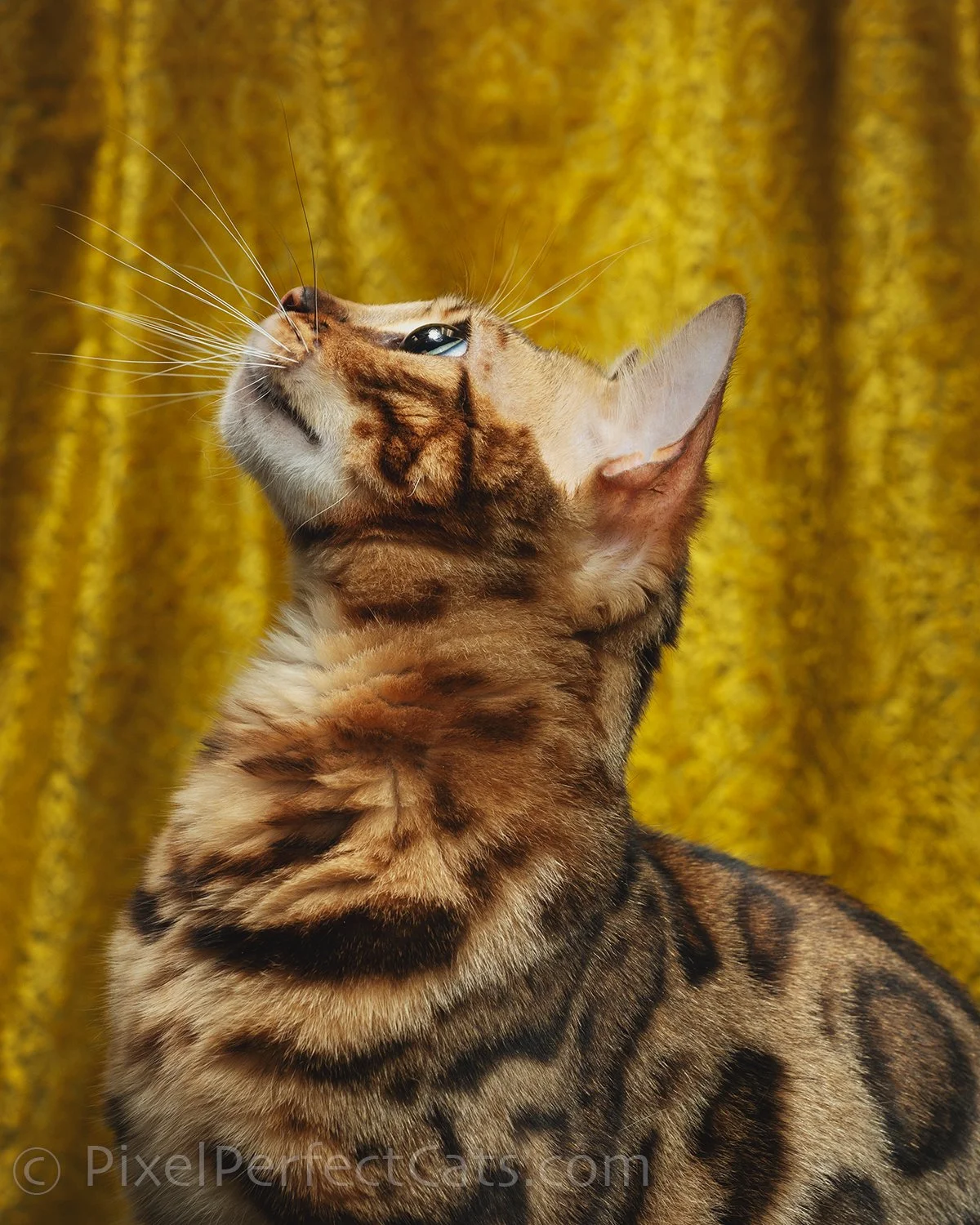 Zoya is a petite, curly girl who is completely at home with all the big active Bengals. Independent but never aloof - she loves to be petted and she will let you know exactly where, when, and how she needs attention